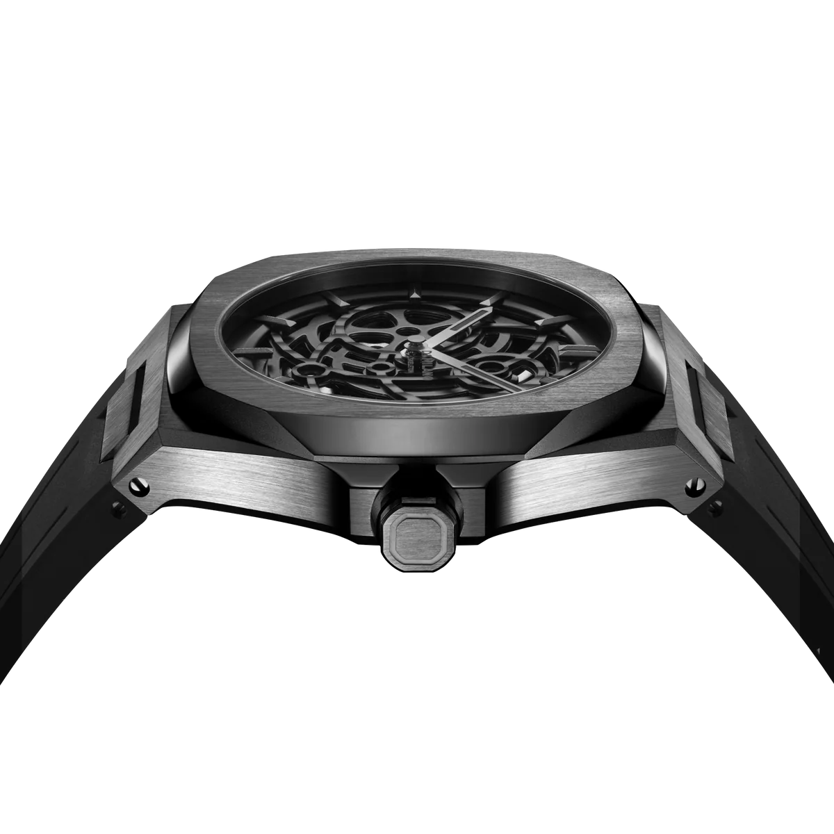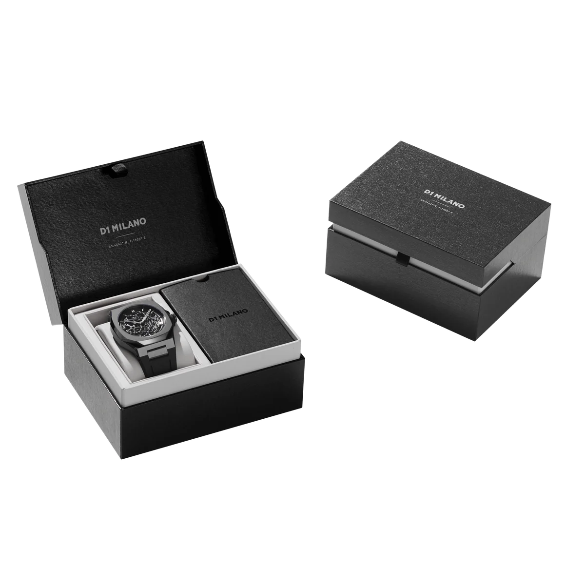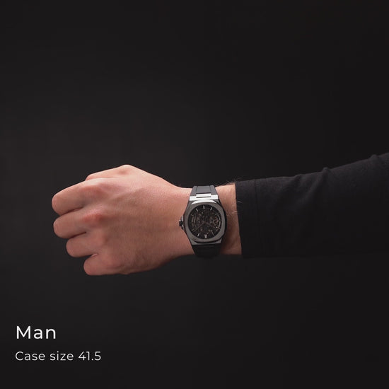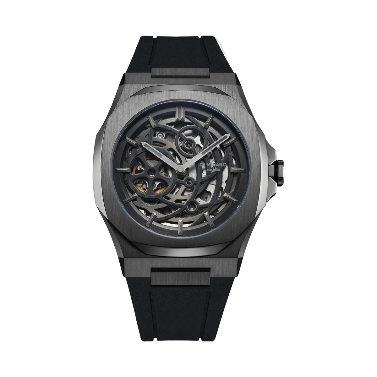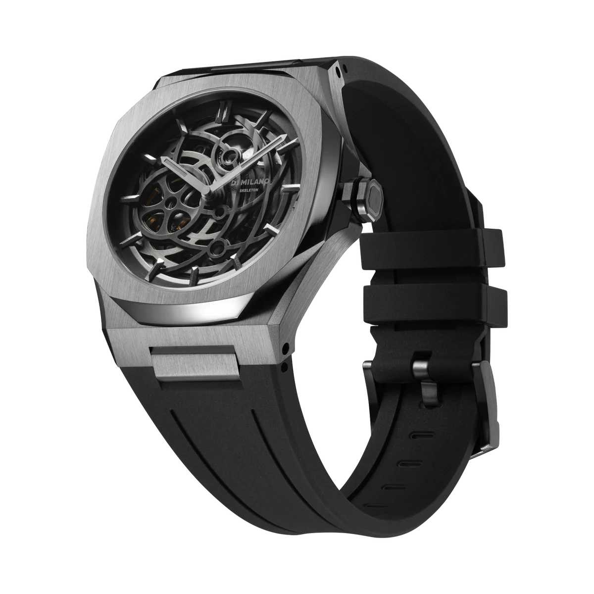 Montre de la maison italienne "D1 Milano" : La montre Skeleton Bracelet 41.5 mm Gun metal rubber merveille mécanique, repensée pour les sportifs et les audacieux. Dotée d’un nouveau cadran squelette transparent, d’un mouvement automatique à 24 rubis et d’une âme en acier inoxydable couleur gun metal.