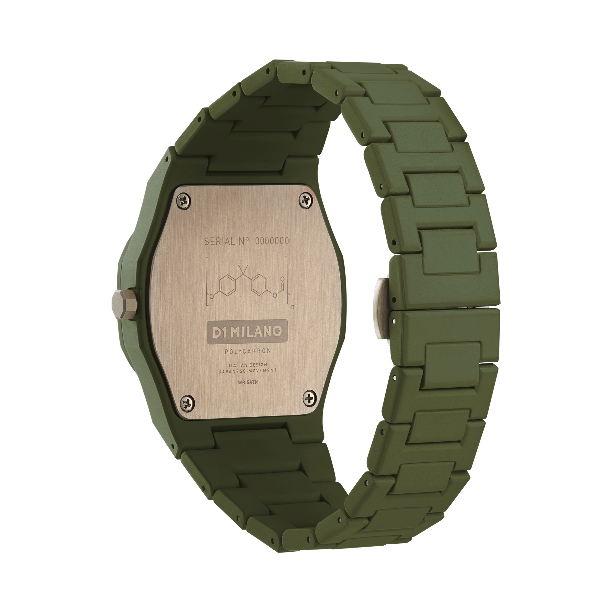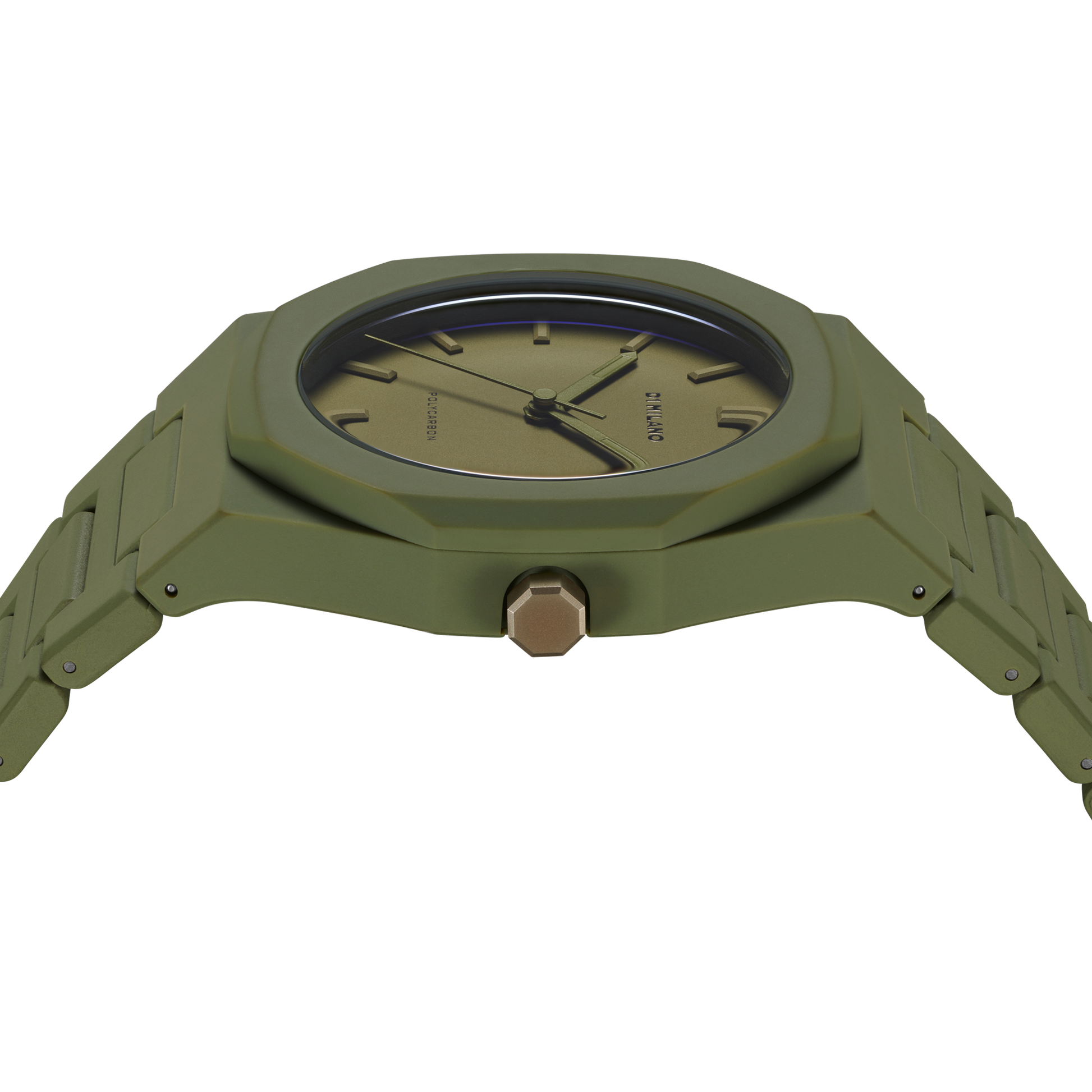 Montre de la maison italienne "D1 Milano" : La montre Polycarbon 40.5 mm Military Green arbore un cadran vert militaire et un bracelet en polycarbonate, idéale pour un look robuste et moderne.