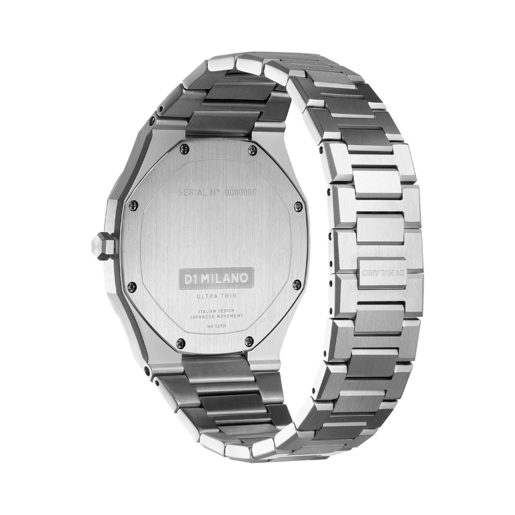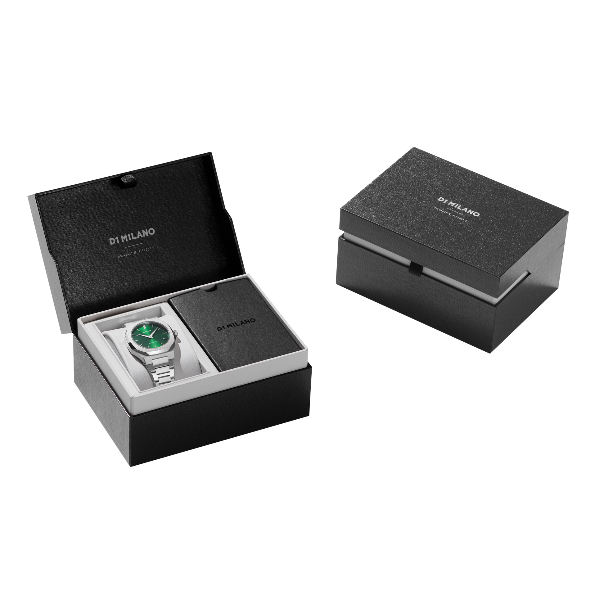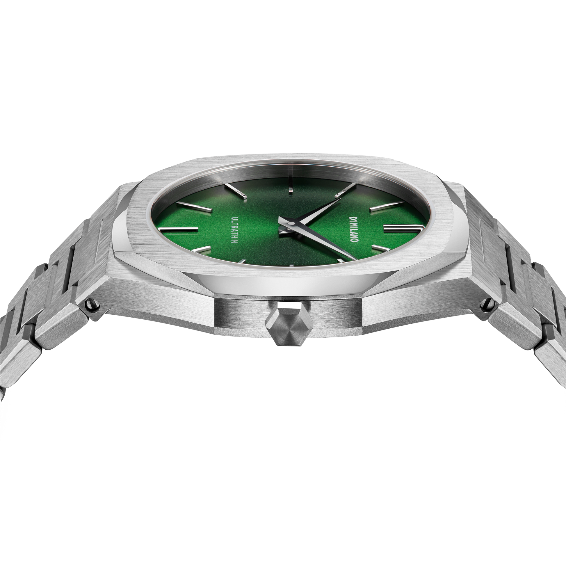 Montre de la maison italienne "D1 Milano" : La montre Ultra Thin Bracelet 34 mm Petite Moss combine un cadran vert mousse et un bracelet en acier inoxydable ultra-fin, parfaite pour un look naturel et élégant.